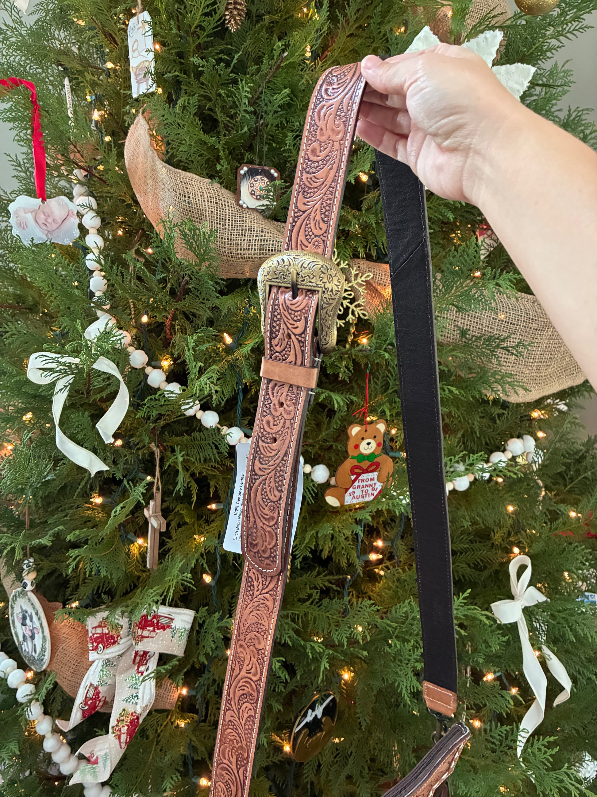This purse is an absolute stunner!! This bag has a hand tooled flower leather detail on the front panel, leather fringe, and a zipper closer. The front panel is genuine Hair-on hide and the back panel is smooth leather. The strap is a 52” hand tooled leather strap that is detachable.