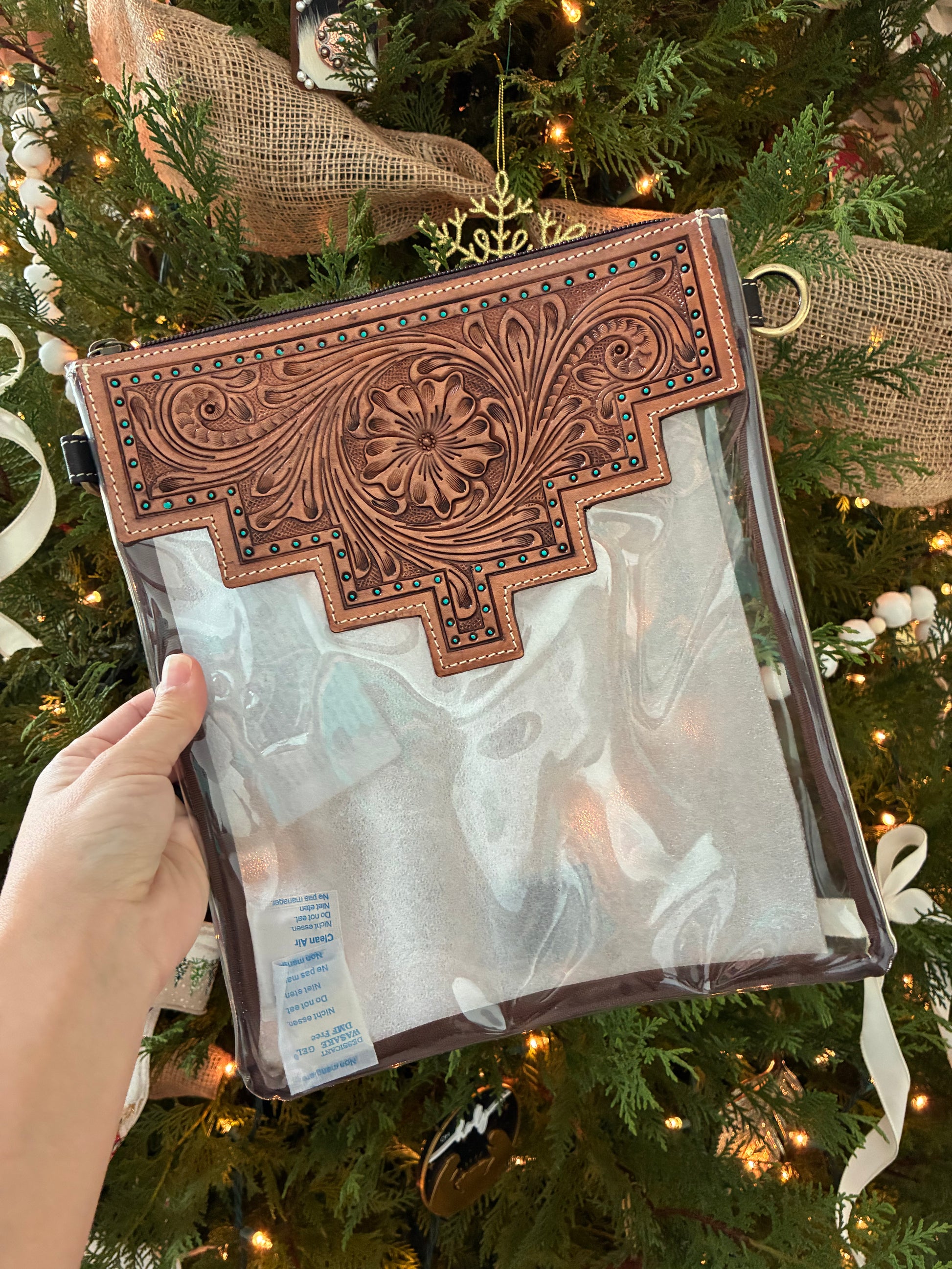 Shayne hand tooled large crossbody clear concert bag. This roomy bag is made for all your concert and game day needs with clear thick vinyl and zipper closure.