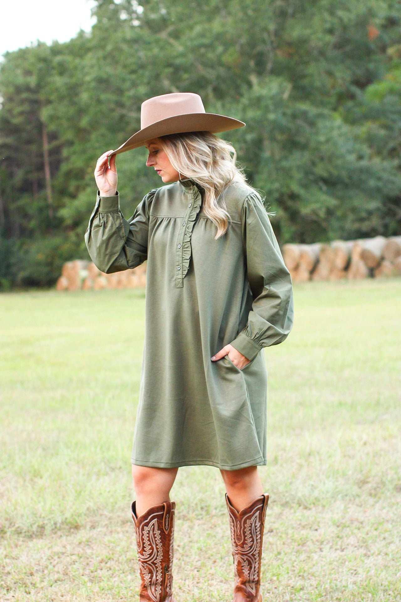 This beautiful mix match material shift dress is as soft as they come! It has ruffle details, side pockets, and functioning buttons.
