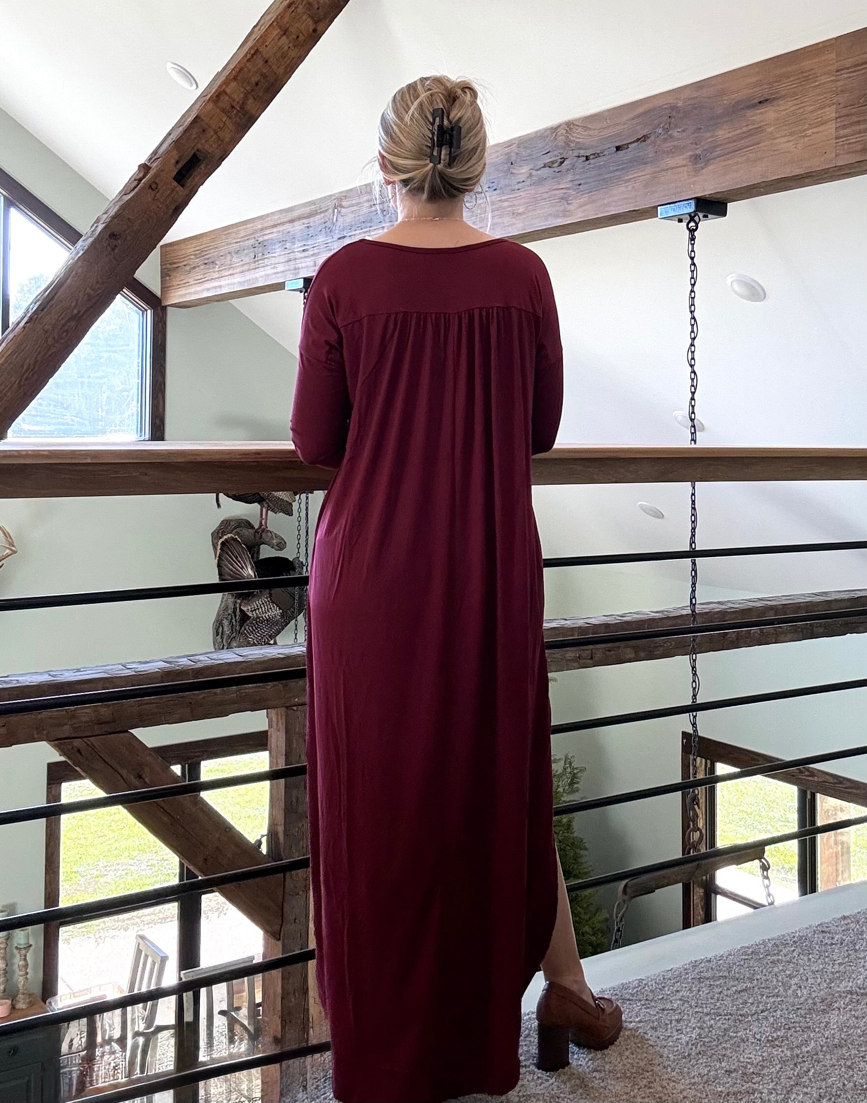 This dress is loose fit with a round hem, v-neck line, and pockets.