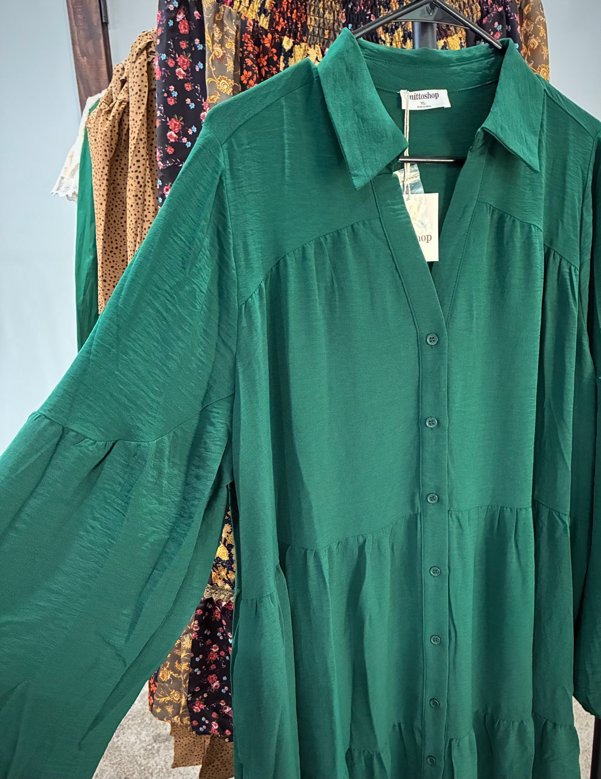 This beautiful hunter green dress is light weight and flowy so it will be comfortable to wear year round!